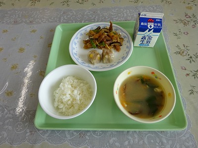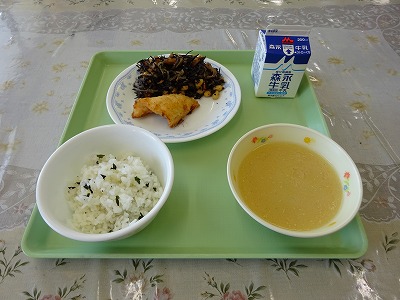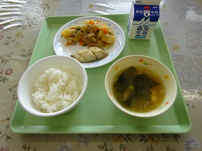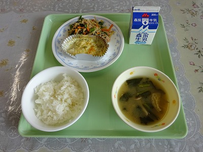 小坂鉱山でとれる黒鉱をイメージした「鉱山の子カレー」は、イカ墨が入ったシーフードカレーです。希少価値が高かった黒鉱がとれたおかげで小坂町は大きく栄えたそうです。今日はデザートに小坂産のぶどうもつけました。 ・ごはん ・牛乳 ・ふわふわ鶏つくね ・なめたけ和え 今日の主菜は「ふわふわ鶏つくね」です。ふわふわの秘密は「ふ」です。つくねの中に、細かく砕いた板麩が入っているので、ふわふわに仕上がります。 ・ごはん ・牛乳 ・たらのみそネーズ焼き ・切り干し大根の胡麻和え マヨネーズに、玉ねぎと長ねぎのみじん切りと、みそを混ぜたソースをタラにかけて、とけるチーズをのせて焼きました。魚ですが、人気のあるメニューです。ご家庭でもぜひ試してみてください。 ・肉うどん ・牛乳 ・ブロッコリーのカレーソテー ・かぼちゃのケーキ 肉うどんは出汁がよく出ていました。ソテーはカレー味で食べやすく、ふわふわのかぼちゃケーキは甘くておいしかったです。今日もしっかり食べて学習発表会、坂中祭の準備と練習をがんばっています。 ・ねぎ塩ぶた丼 ・牛乳 ・ほうれん草のツナ和え ・豆腐のみそ汁 ねぎ塩ぶた丼には、レモン果汁が入りました。レモンとねぎの香りでさっぱり食べることができます。 ・ごはん ・牛乳 ・ヤンニョムチキン ・野菜炒め 初登場のヤンニョムチキンは、ケチャップにトウバンジャンで辛さを、水あめで甘さをプラスしました。ほとんどのクラスが完食でした。人気メニューの一つになればうれしいです。 ・ごはん ・牛乳 ・野菜たっぷり豚キムチ ・擬製豆腐 擬製豆腐とは、精進料理のひとつです。昔のお坊さんは、堂々と肉やたまごを食べることができなかったそうです。だから豆腐や野菜を混ぜて食べていたのだそうです。給食ではたまごと豆腐、ひじき、ひき肉、にんじん、いんげんを入れて作りました。 ・ミートソーススパゲッティ ・牛乳 ・鶏肉のハーブ焼き ・フレンチサラダ ミートソーススパゲッティの日に、気をつけなければならないことは、もりつけの時ソースを足りなくしないこと、服にソースをつけないこと、食べ終わったら口のまわりをふくことです。 ・ごはん ・牛乳 ・肉じゃが ・ほっけごま塩焼き 肉じゃがは、味が染み込むように、でも煮崩れないように丁寧に煮込みました。調理員の思いが伝わったのでしょう。容器が空っぽで戻ってきました。 ・玄米入りカラフルポーク丼 ・ジョア(マスカット) ・チップスサラダ ・ほうれん草のみそ汁 チップスサラダは、砕いたポテトチップスをトッピングしたサラダです。これだけでサラダの残量がぐーんと減るので不思議です。 ・わかめごはん ・牛乳 ・赤魚の塩こうじ唐揚げ ・だいずの磯煮 「まごわやさしい」とは、日本の伝統的な食材の頭文字を合わせた合言葉です。手軽にいろいろなものが手に入る現代では、食生活が乱れる方も多くなってきました。この合言葉を意識することで、食生活を改善することができるかもしれませんよ。 ・冷やし中華 ・牛乳 ・手作り!ピーチパイ コメント