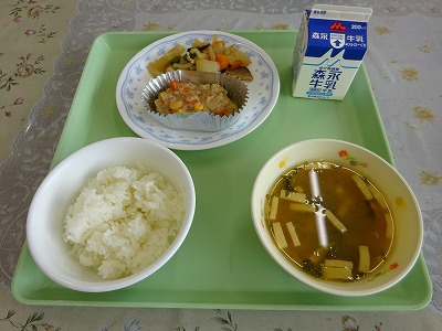 ・大根と豚肉の煮物 コメント 英語で「肉」という意味の「ミート」と「ひとかたまり」を意味する「ローフ」を組み合わせて「ミートローフ」呼ばれるようになりました。給食ではひき肉に、豆腐、玉ねぎ、にんじん、大豆、コーン、枝豆が入った和風のミートローフです。調理員が一つ一つ、カップに入れてくれました。 ・コッペパン ・牛乳 ・ほうれん草オムレツ