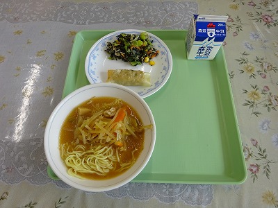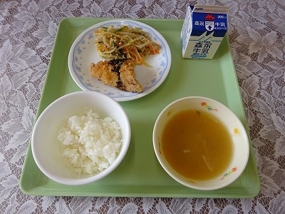 ・もやしの炒り煮 コメント 赤魚はかたくり粉をつけて揚げ、黒ゴマを入れた甘辛いしょうゆだれをかけました。骨がなく、食べやすかったので、残量がほとんどありませんでした。 ・みそラーメン ・牛乳 ・棒ギョウザ