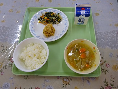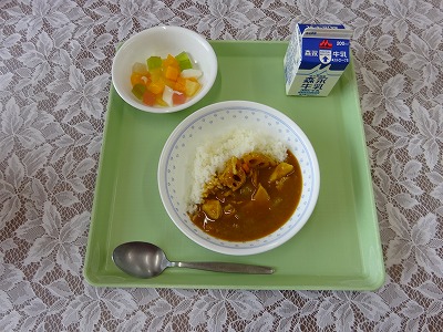 コメント 今日のカレーは秋が旬の食材がたくさん入りました。にんじん、玉ねぎの他、じゃがいもの代わりにさつまいもと、れんこん、エリンギが入り食感を楽しんで食べることができました。完食したクラスがたくさんあり、調理員がうれしそうでした。 ・ごはん ・牛乳 ・スタミナ納豆