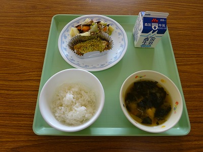 ・野菜のツナ和え コメント かりん揚げは、人気メニューの1つです。さっくり揚げた豚肉に、特製の甘辛いタレをからめて、アーモンドとごまをまぶして仕上げました。容器が空っぽで戻ってきたクラスがほとんどでした。 ・ごはん ・牛乳 ・まるい卵焼き