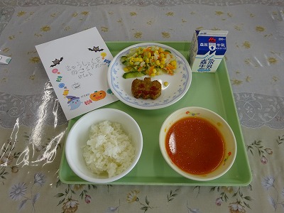 今日はハロウィン。給食では、かぼちゃ入りのかぼちゃ型ハンバーグと、真っ赤なドラキュラスープが付きました。小学校では、給食委員会がハロウィンの衣装をつけて各クラスをまわり、メッセージカードをくばりました。 ・大豆たっぷりミートソース ・牛乳 ・鶏肉のマーマレード焼き