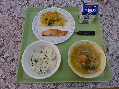 ミートソースの赤、とり肉のコーンマヨネーズ焼きの黄色、野菜スープのみどりと、色彩の良い献立になりました。パスタの日はソースが足りなくなってしまうクラスもあるのですが、今日は丁度よく盛り付けることができました。 ・ごはん ・牛乳 ・野菜炒め