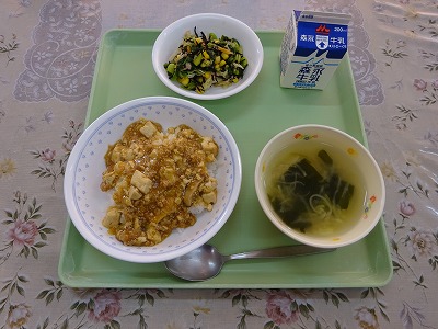 今日は新メニューに挑戦しました。厚揚げにねぎとすりごまを入れたみそをぬって、チーズをかけて焼きました。担当の調理員はドキドキしながら、その他の調理員もワクワク楽しそうに作業していました。 ・麻婆丼 ・牛乳 ・ミネラルたっぷりサラダ