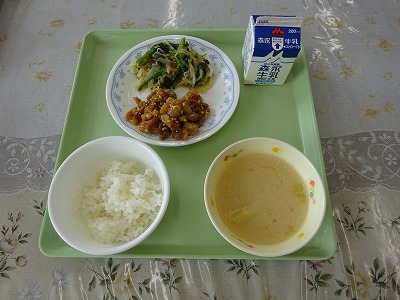 ・キムタク丼 ・牛乳 ・ひじきサラダ コメント 今日は節分です。豆をまくことで、オニを追い払い、福を招くと言われています。このオニというのは、災いや、病気などの目には見えないものをさします。給食では、メイプル味の大豆をつけました。しっかり食べて、体の中からオニを追い出しました。 ・ごはん ・牛乳 ・鶏肉南部焼き ・うすくず汁 コメント 肉や魚に、ごまをつけて焼いたものを「南部焼き」といいます。青森県と岩手県にまたがる地方を以前、南部地方と呼び、この地方がごまの名産地であることからこの名前がついたそうです。