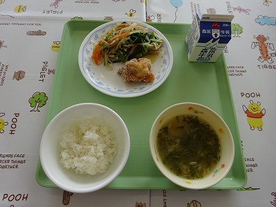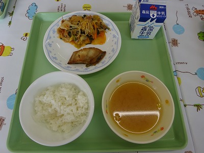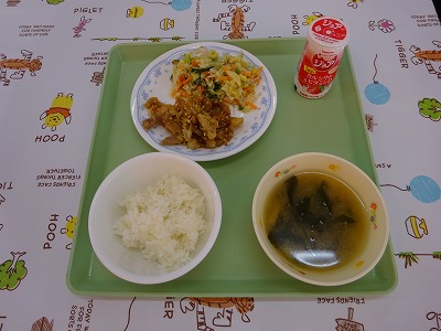 キムチの歴史は4000年以上前にさかのぼるそうです。キムチの名前は野菜の塩漬けを意味する「キムチェ」からついたそうです。はじめは野菜の塩漬けでしたが唐辛子などの香辛料が使われるようになりました。今日は野菜をたっぷり使った豚キムチです。 ・ごはん ・牛乳 ・若鶏からあげ