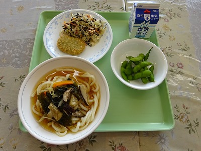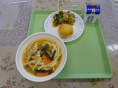 ・ひじきのカレー煮 コメント ひじきは見た目が黒くて地味ですが、とってもパワーのある食べ物です。少しでもおいしく食べてもらいたいと思い、今日はカレー味にしました。 ・なめこ根菜うどん ・牛乳 ・ビスキュイパン