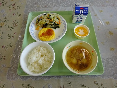 ・野菜のごま酢和え コメント 満月のようなまるいたまご焼き、里いもと白いもちが入ったお月見汁、月に浮かび上がるうさぎに見立てたゼリーをつけました。10月6日は十五夜です。晴れて美しい月が見られるといいですね。 ・五目うどん ・牛乳 ・和風コールスローサラダ