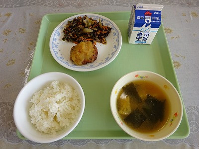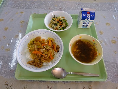 ・野菜のツナ和え コメント かりん揚げは、人気メニューの1つです。さっくり揚げた豚肉に、特製の甘辛いタレをからめて、アーモンドとごまをまぶして仕上げました。容器が空っぽで戻ってきたクラスがほとんどでした。 ・ごはん ・牛乳 ・まるい卵焼き