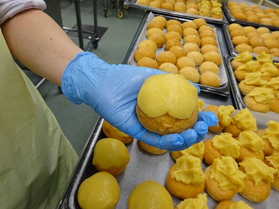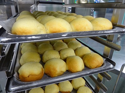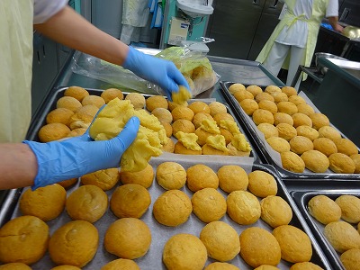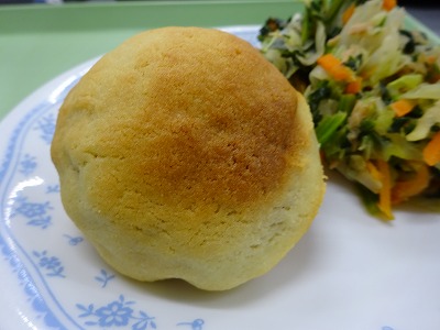 ・とんぶり和え コメント 今日はとんぶり和えの予定でした。収穫はできているそうですが、加工が進んでいないそうで、とんぶりが届きませんでした。楽しみにしていた方、ごめんなさい。人気メニューのビスキュイパン。調理中の様子をぜひ、ご覧ください。 ・ごはん ・牛乳 ・たらのもみじ焼き
