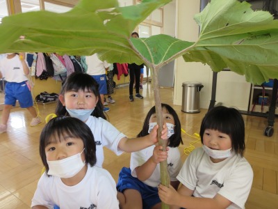 ↑「トトロの傘みたい」と秋田ふきに興味津々の子どもたち